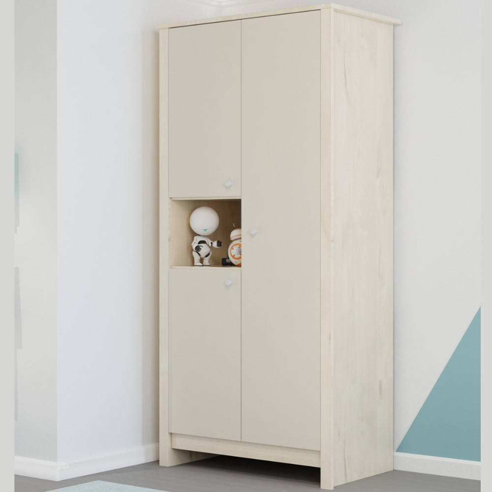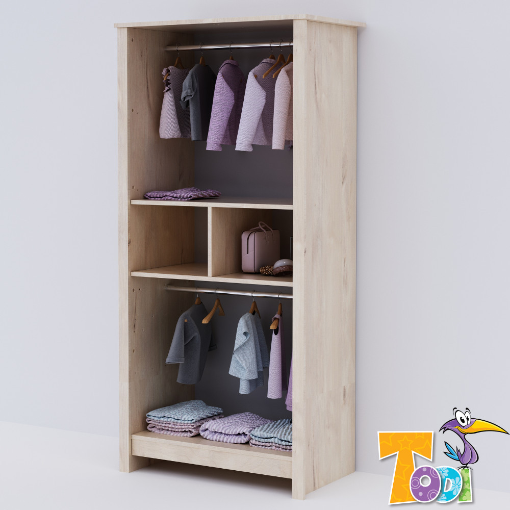 A Todi Happy bútorcsalád egyik tagja a nagyszekrény, aminek tervezésekor arra törekedtünk, hogy kényelmesen pakolható, praktikusan kihasználható legyen. A nyitott polc alatti és feletti, ajtókkal takart részek akasztós kivitelűek, melyek plusz polcok megvásárlásával könnyen átalakíthatók játék vagy hajtogatott ruha tárolására.
